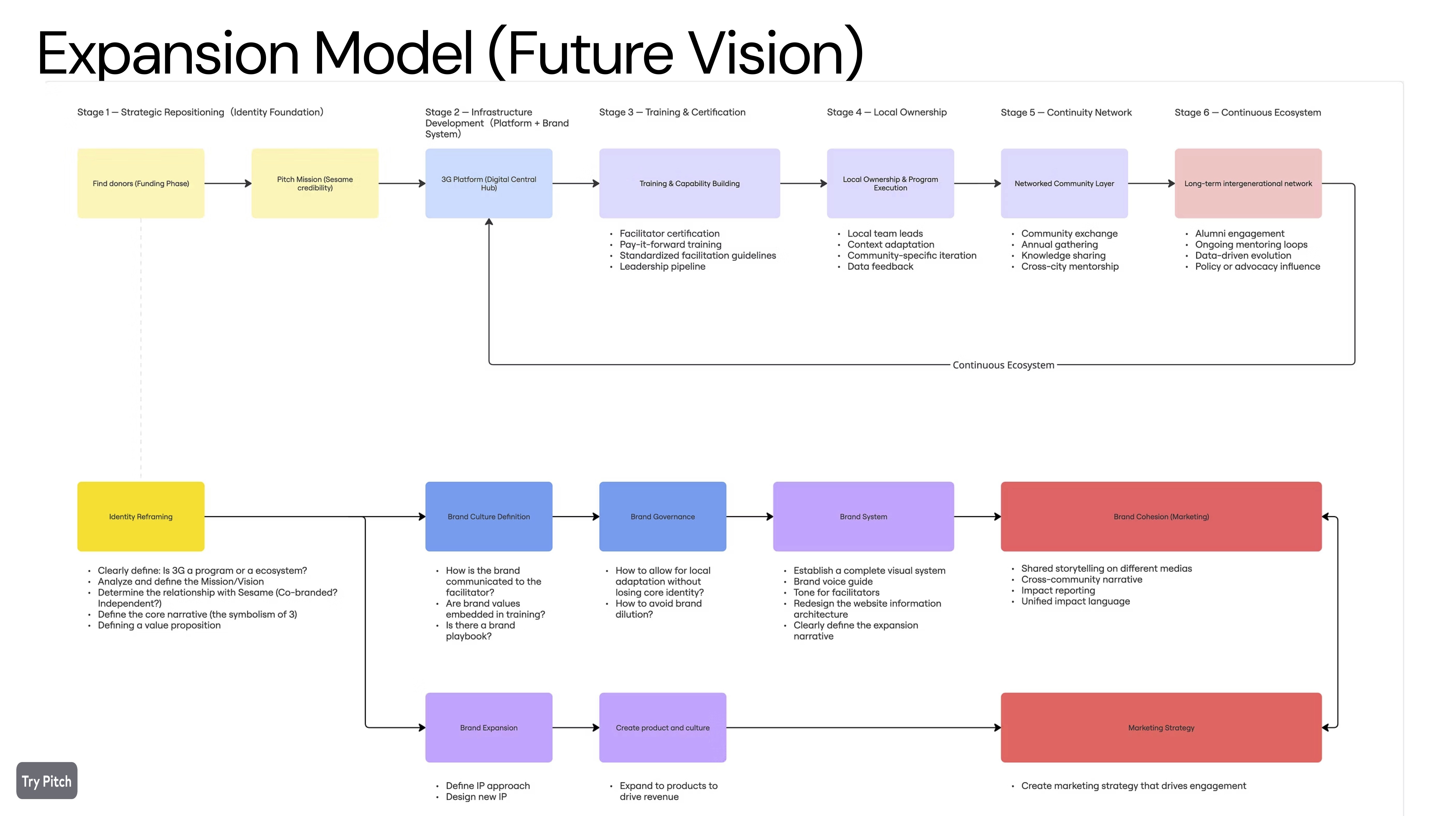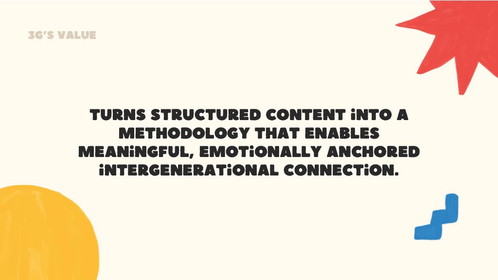 3G Mentoring delivers a meaningful intergenerational experience, but the program's expansion is constrained by a linear delivery model, limited digital infrastructure, and early-stage branding. 3G's program heavily depends on fundraising and central coordination, leaving no long-term system — no content, partnerships, or training frameworks — to sustain and grow the program. Additionally, its lack of a clear brand identity independent of Sesame Street and its reliance on grants and donations further limit expansion.