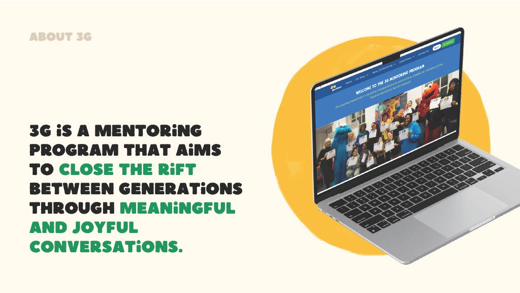 Brand and engagement strategy for 3G Mentoring, a nonprofit created by the makers of Sesame Street to build intergenerational connections. The 3G program connects seniors, students, and preschoolers in online or in-person sessions centered on Sesame Street segments and guided discussions to promote growth, learning, creativity, self-esteem, and social skills.