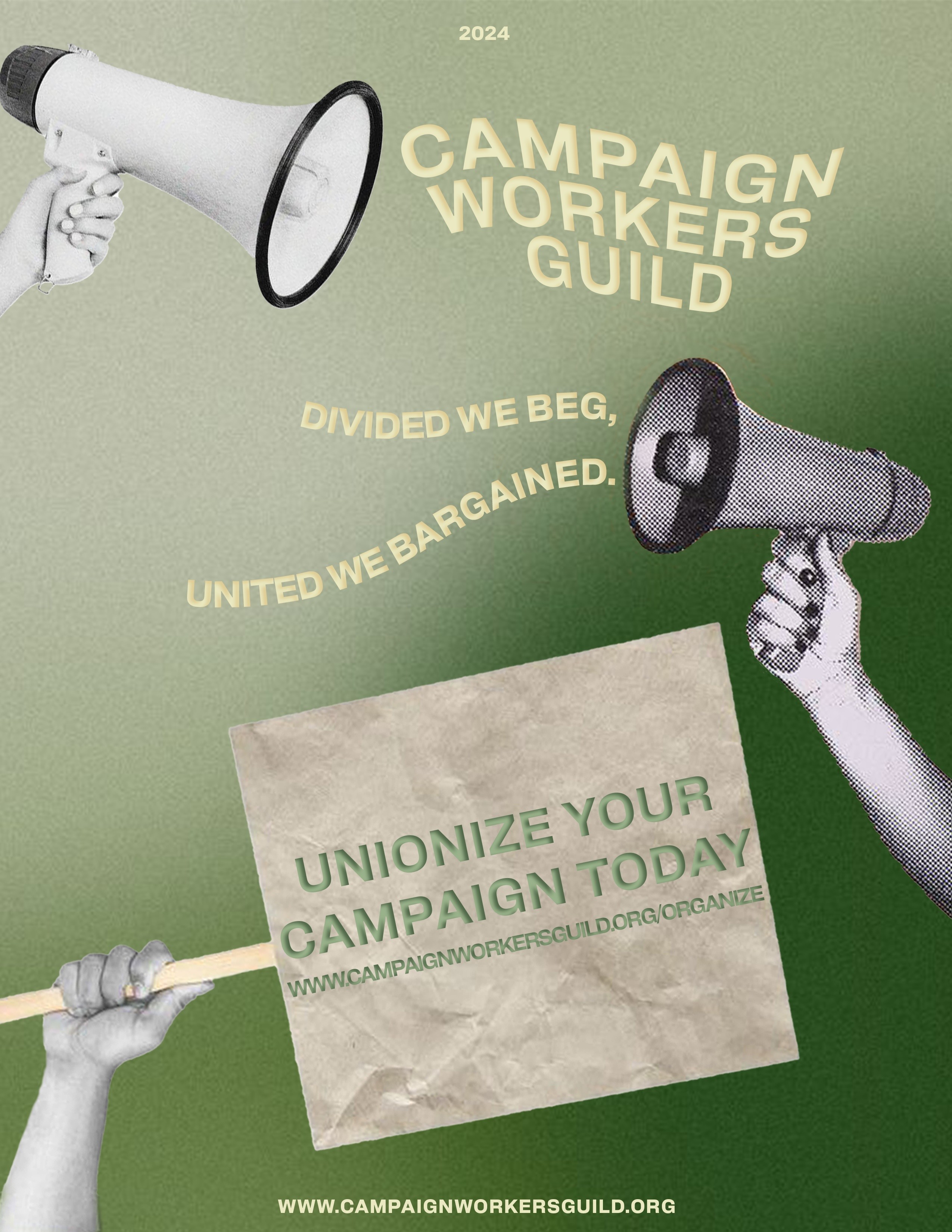 The Campaign Workers Guild (CWG) is a labor union that represents workers involved in political campaigns, including field organizers, canvassers, digital staff, and other campaign employees. The CWG seeks to provide campaign staff with fair wages, health insurance, worker protections, job security, and other labor rights frequently missing in the fast-paced, often temporary world of political campaigns.