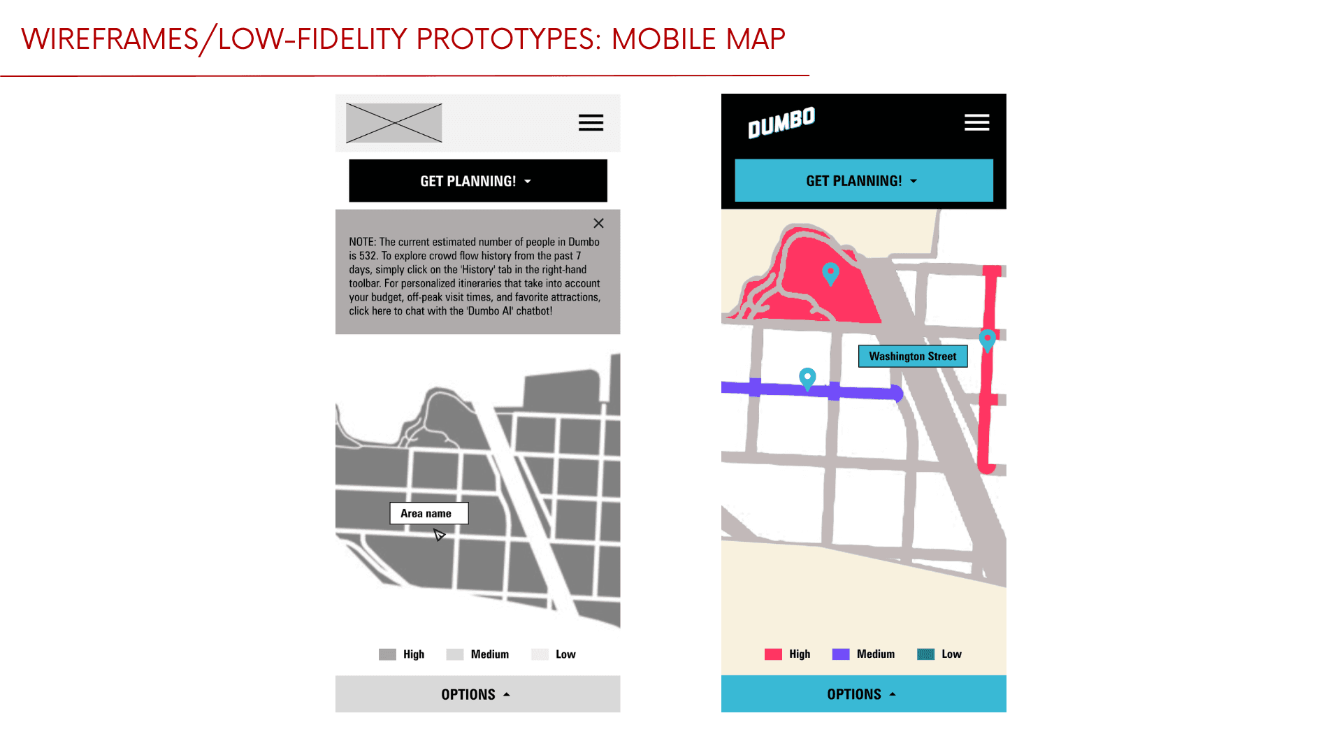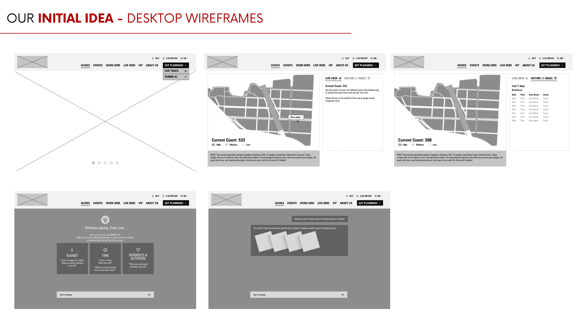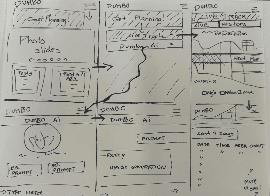 Created wireframes and low-fidelity prototypes for the mobile home page, live map, and AI chat