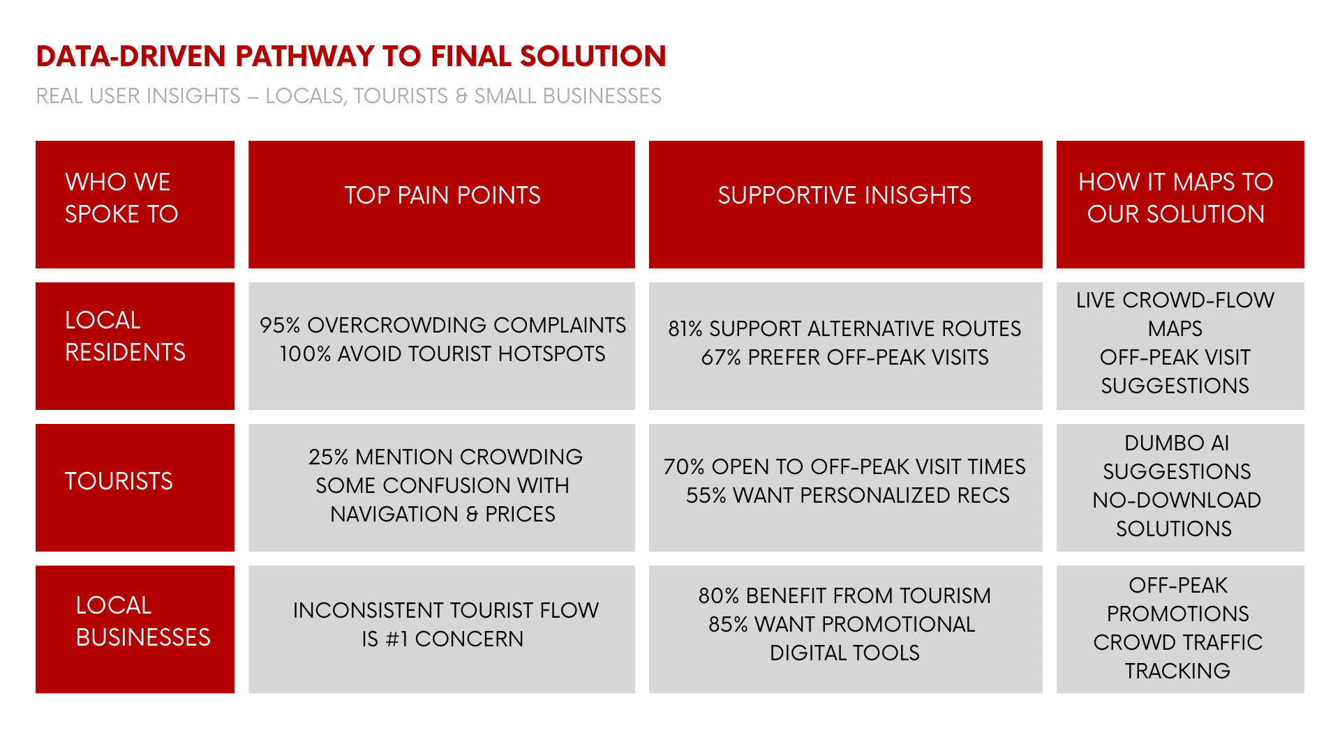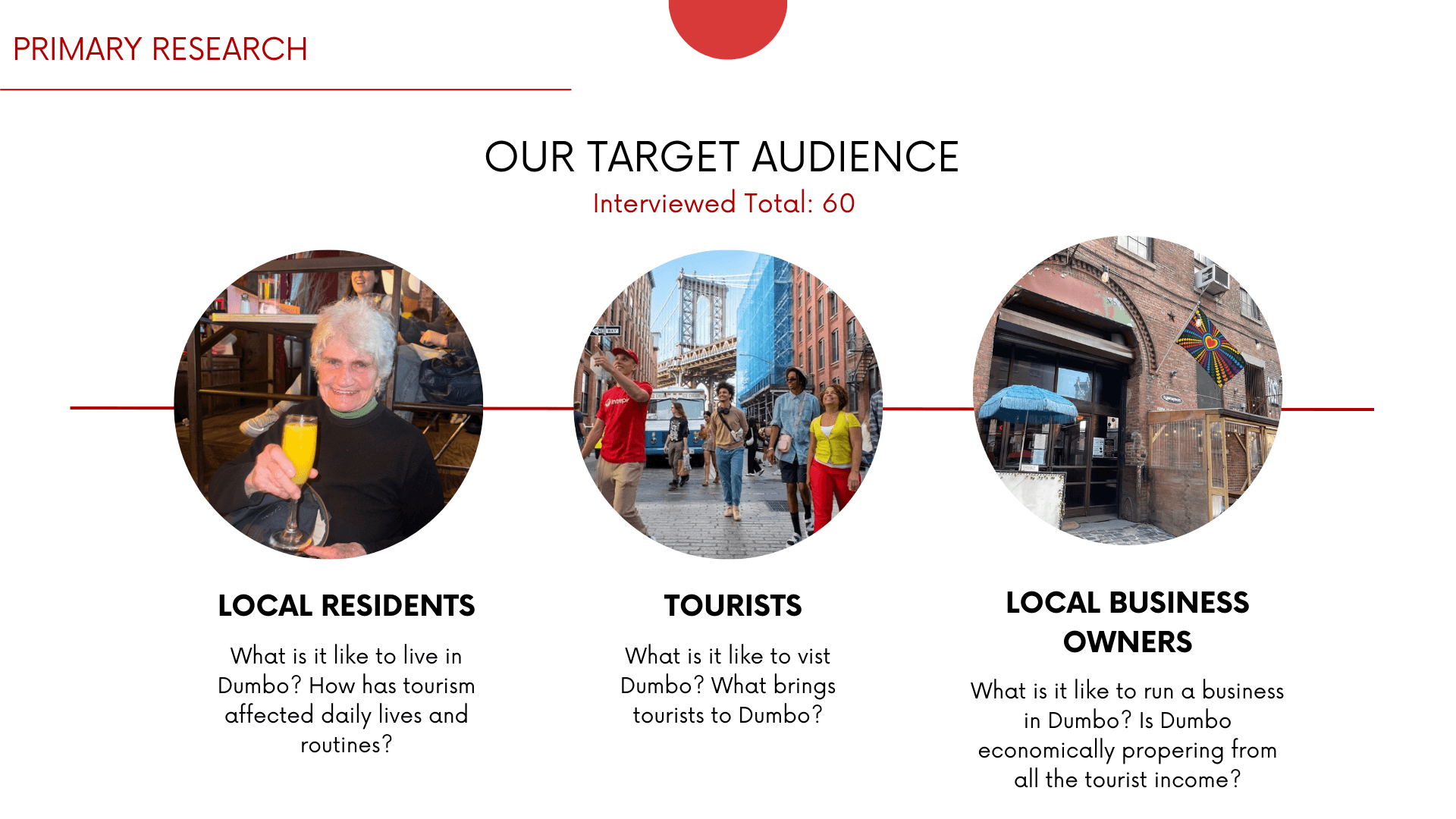 Conducted 60 in-person field interviews (20 residents, 20 tourists, 20 local business owners)