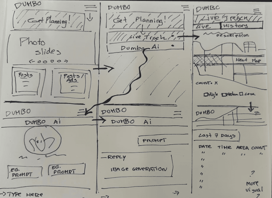 Our solution reimagines the DUMBO Improvement District's current website as a mobile application, offering greater accessibility to tourists on-the-go. While retaining the existing features, our solution is delivered through the new "Get Planning!" button. Through this button, tourists can access two features: a live map and a DUMBO AI chatbot. The live map shows estimated crowd sizes in popular streets as well as a past log, allowing tourists to plan their trip accordingly to avoid crowds. The DUMBO AI chatbot provides answers to any questions a tourist might have, such as local restaurant and shopping recommendations, more affordable options, or a full-day itinerary including activities in lesser-visited spots. Local residents and business owners also have the opportunity to co-design by working on the back-end, creating a solution that makes travel more sustainable for all stakeholders involved.