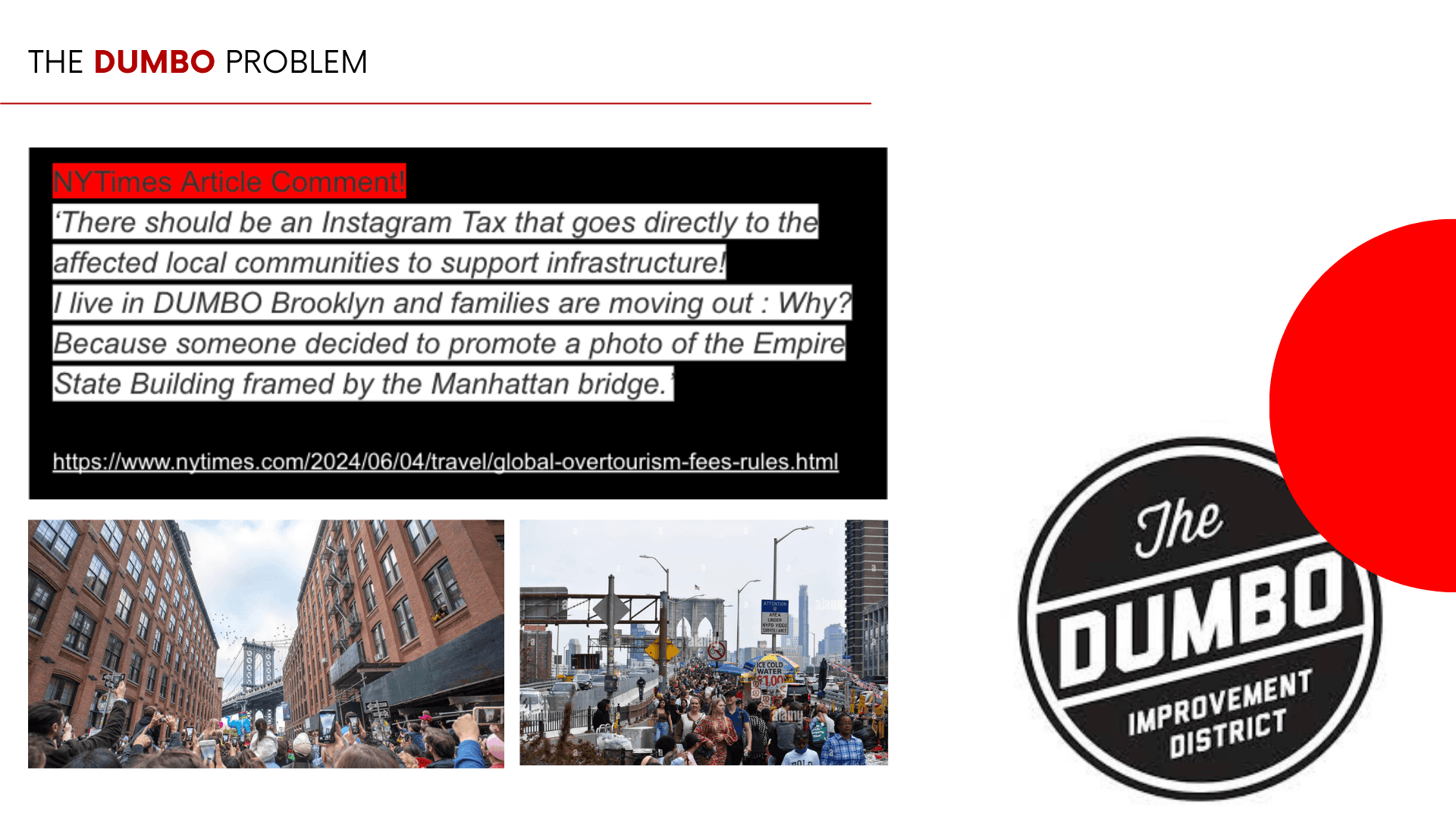 DUMBO faces significant tourism-related challenges, including overcrowding, rising living costs, and increased commercialization. Visitor activity is concentrated on a few streets offering popular photo spots and access to Brooklyn Bridge Park, creating congestion and noise in a small area while diverting foot traffic away from others. For residents and local businesses, this concentration reduces the affordability and quality of life while ultimately diminishing the overall visitor experience.